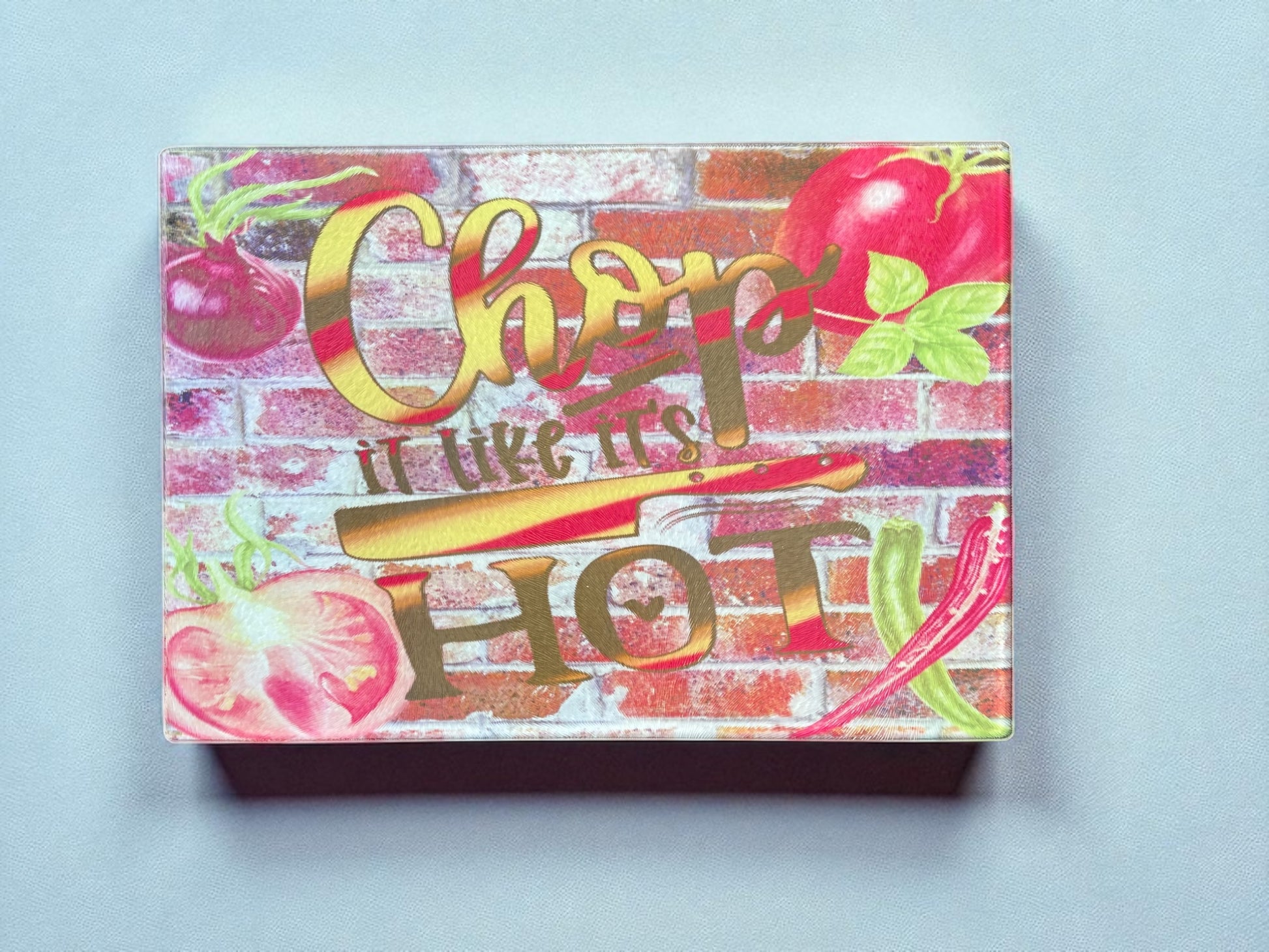 Bring energy to your kitchen with this 11x7 glass cutting board featuring bright, vibrant colors and the playful slogan "Chop it while it's hot." Perfect for adding a fun twist to your food prep, it offers a durable, easy-to-clean surface that keeps your cooking lively and efficient.