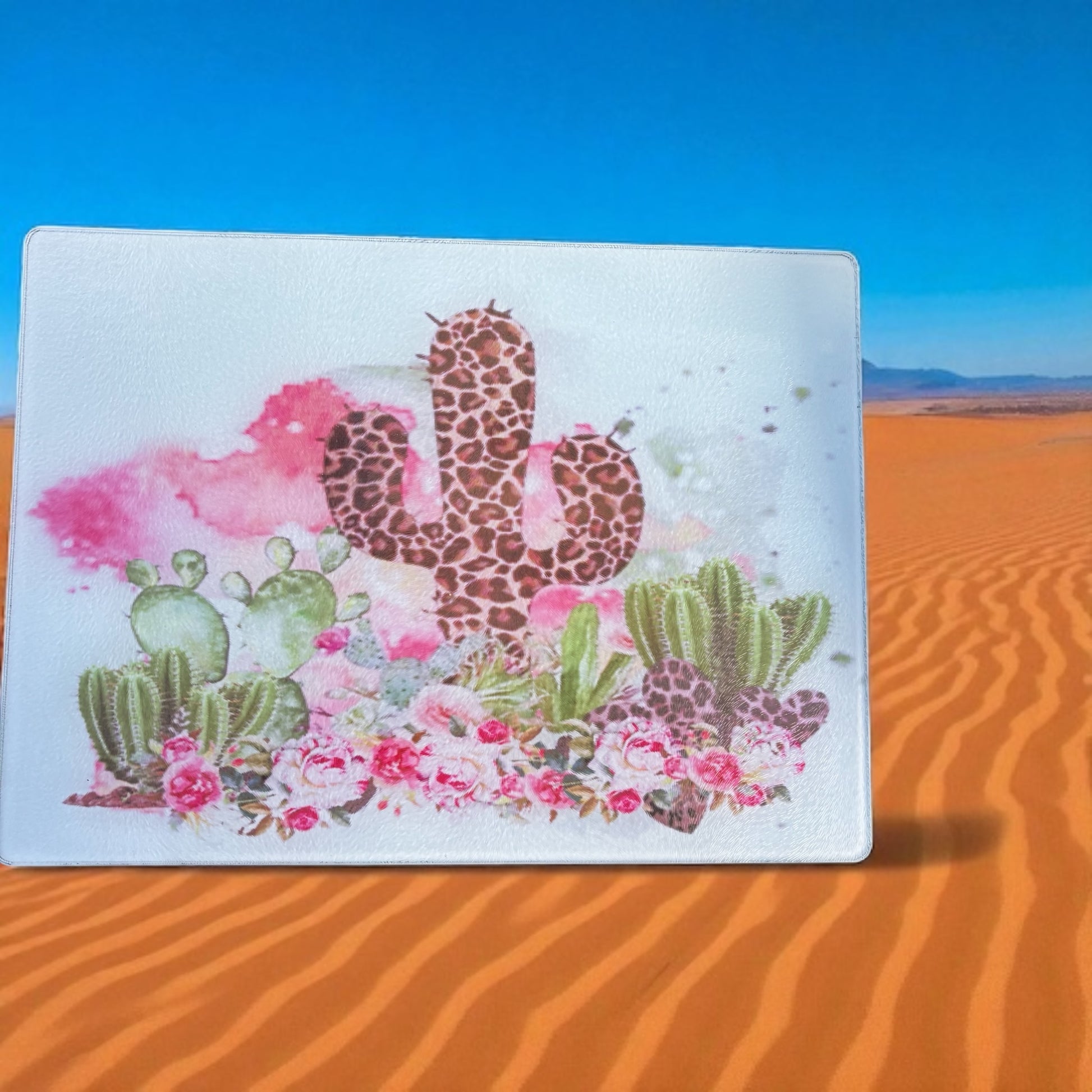 Add a desert vibe to your kitchen with this 11x15 large glass cutting board. Featuring a desert-inspired design, it combines vibrant colors and bold patterns to make food prep fun while providing a sturdy, easy-to-clean surface.